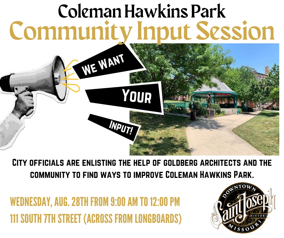 We Want Your Input! Goldberg Group Architects will be available on Wednesday, August 28th from 9:00 am to 12:00 pm at 111 S. 7th Street (across from Longboards) to answer questions and provide 3 potential site plans for revisioning Coleman Hawkins Park. Attendees will also have the opportunity to draw up their own ideas